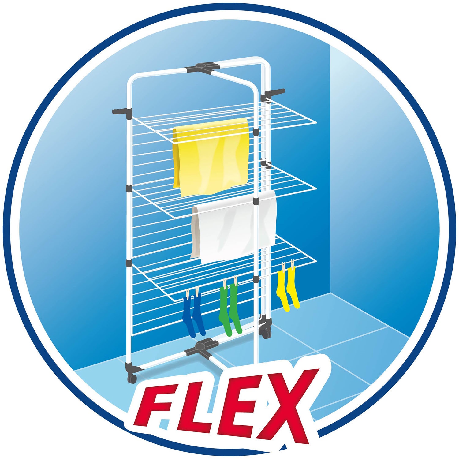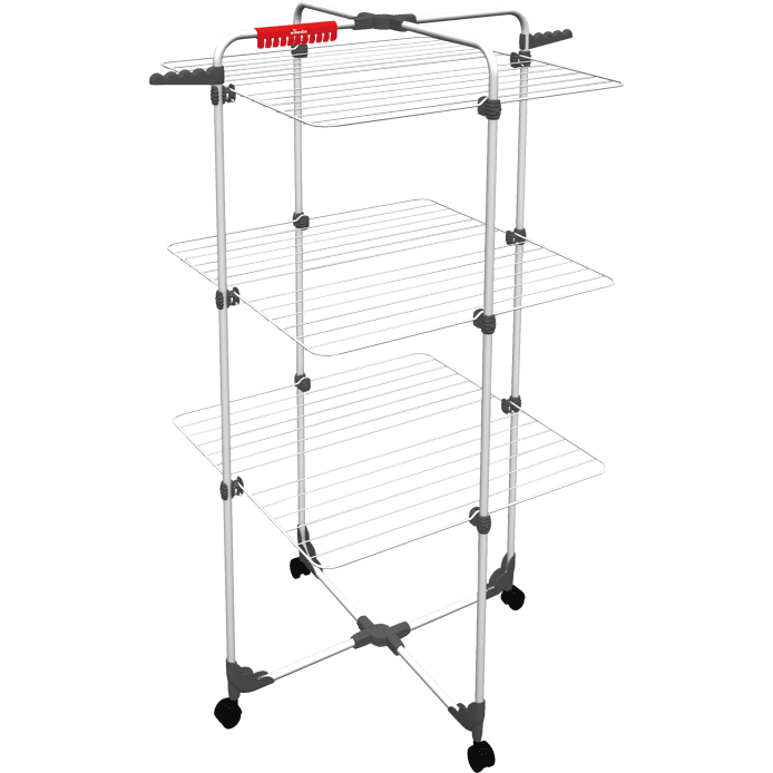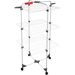 Dit stalen wasrek heeft verschillende verdiepen met afzonderlijke plateaus voor een optimale afstemming op de verschillende soorten wasgoed. De toren heeft een droogcapaciteit van 30 meter.